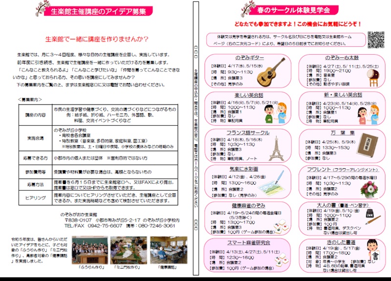 のぞみがおか生楽館〒838-0107小郡市希みが丘5丁目2番地17TEL/FAX 0942-75-6607
